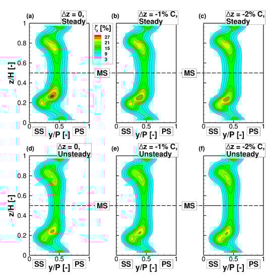 Due to constructive restrictions it is not possible to experimentally evaluate the isolated effect of the relative motion between the vane tips and the underlying hub endwall on the TLV, see also Section 2.2.1. For this purpose, the numerical method is conducted. This is suitable as the results from the CFD show good agreement with the experiments for the other three cases, see Figure 3. An overprediction of the losses associated with the TLV is apparent for the numerical results, which is assumed to be due to the computational model not being able to correctly capture the turbulent structures of the TLV. Nevertheless, size and position of the TLV agree for the different endwall motion cases between numerical and experimental data to a sufficient extent rendering the following discussion valid, see also Koppe et al. [].