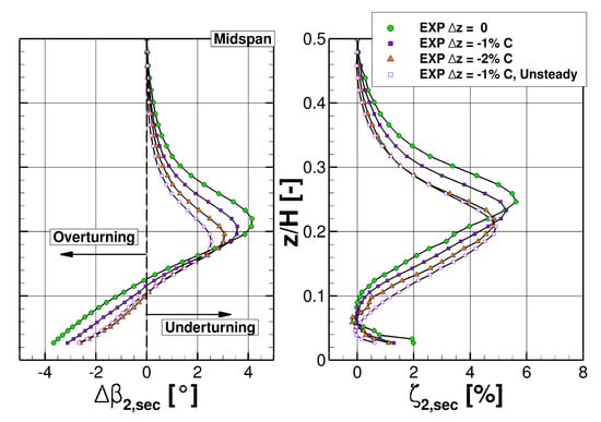 Pitchwise averaged (a) total pressure losses  and (b) flow angle deviation , downstream of the blade (plane at ). Experimental data from Krug et al. [].
