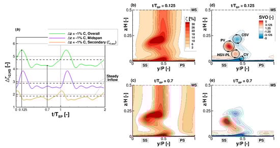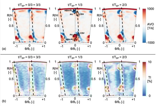 The flow in the vicinity of the hub endwall features two opposing secondary flows when the stationary shroud ring is installed. The first resulting from the pressure gradient between the pressure and suction side of two adjacent vanes, the cross passage flow, and the second arising from the flow over a vane tip, the tip leakage flow, which rolls up into the TLV and continues further downstream. The cross passage flow aids to the tendency of the TLV to follow the SS contour of the vane where it emerged. The vortical structures within the lower half of the stator passage are visualized via isosurfaces of the  vortex identification criterion, cf. [], in Figure 3h. Here an additional smaller secondary vortex is identifiable next to the TLV which is induced by the interaction of the cross passage flow and the TLV. Its rotational direction is opposing to the TLV’s and thereby adding to the prior described trend of following the SS contour. For the case with RM the cross passage flow is suppressed by the no-slip condition on the hub endwall, which also has a dragging effect on the TLV. Hence, a shift of the TLV’s trajectory in the direction of the wall movement, which is towards the adjacent vanes PS, is apparent. This dragging effect as well as a higher interaction of the TLV with the free passage flow reduces its extension in spanwise direction. The apparent decreased values of non-dimensional total pressure loss coefficient in MP5, see Figure 3f, must be put into perspective considering the insertion of energy into the boundary layer flow of the hub endwall due to its rotation. The aforementioned secondary induced vortex is not distinctly identifiable here, see Figure 3j.