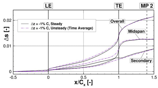 Setting the hub endwall for stage 1 to the design rotational speed the combined effect of a skewed inflow boundary layer and a relative motion between the vane tip and the underlying wall can be analyzed. Comparing Figure 3a,c for the experimental and Figure 3d,g for the numerical results, it becomes clear that the influence upon the trajectory of the TLV increases. Both phenomena weaken or rather eliminate the cross passage flow between the PS and SS of two adjacent stator vanes in the vicinity of the hub, which in return decreases the passage vortex in this area considerably. Consequently, the progression of the TLV is less influenced by this contra rotating secondary flow. The dragging effect arising from the no-slip condition on the hub endwall further accommodates the drift of the TLV away from its originating vane towards the adjacent PS. The numerical comparison of analog configurations within a linear compressor cascade shows similar influence on the secondary flow, see Section 3.4.4. The decrease of ζ for the case with rotating hub endwall, cf. Figure 3c,g, again, must be put in perspective as the rotation of the hub under S1 induces a flow turning and by this adding energy to the fluid. It is clear, however, that the influence of the high loss region associated with the TLV on the free passage flow is far smaller for the case with a skewed BL and RM.