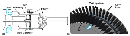 While in current design processes the flow is mostly considered in its temporal average [], the real flow in axial compressors and turbines is strongly unsteady, with turbulence and periodic contributions resulting from the aerodynamic interaction of the blade rows moving relative to each other [,,,]. It exhibits high complexity due to the inner and outer sidewalls and the effects generated by rotation. In fact, the near-wall flow is characterized by the wall boundary layer, blade boundary layers and the interaction of several secondary flow phenomena, such as radial gap vortex, horseshoe vortex and channel vortices, all of them being periodically unsteady in a flow field which is partly transitional and turbulent on top []. The cited effects occur in both, axial compressors as well as axial turbines, but differ considerably according to design features and aerodynamic blade or stage load, so that the different secondary flow phenomena have different characteristics. The intensity of the aerodynamic interaction between the blade rows qualitatively and quantitatively depends on a number of geometric and aerodynamic parameters, such as axial gap width, wake width, velocity deficit of the wake, Strouhal number, flow coefficient, etc. In numerous studies these effects have been investigated with linear cascades [,], and disregard of heat transfer in the case of turbines. On the opposite side, there are many studies on machines of realistic or close-to realistic complexity, with measurements usually complicated by practical aspects [,].