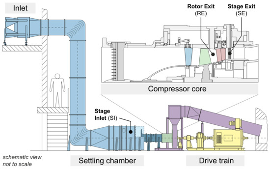 The compressor’s performance was measured with steady instrumentation. Pitot probes and thermocouples, installed in circumferentially fixed mounted measurement rakes, were used to measure the total pressure and temperature at the stage inlet (SI) and stage exit (SE), as marked in Figure 1. Furthermore, static pressure taps were distributed around the circumference in several measurement sections at the hub and casing. The rotational speed and the torque were measured with a torque measurement shaft. The mass flow was determined by means of a calibrated bellmouth upstream of the compressor core.