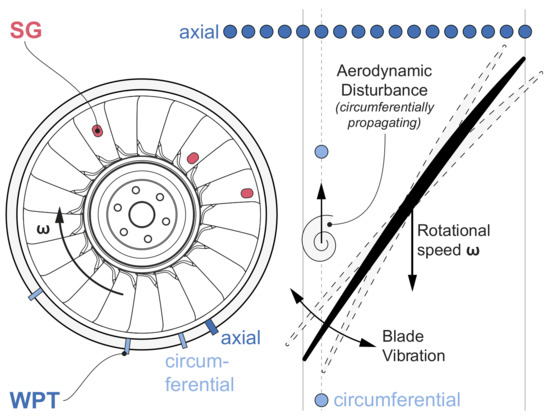 To determine the rotor blade vibrations, strain gauges (SGs) were applied to the rotor blades (see Figure 2). Additionally, piezo-resistive wall pressure transducers (WPTs) were mounted in the casing within the rotor tip region. These SG and WPT sensors were recorded with a sampling frequency of up to 500 kHz, and were therefore appropriate to resolve transient phenomena, such as aerodynamic disturbances and blade vibrations. On the one hand, the WPT sensors were arranged in an axial array that covered the entire axial rotor chord, as well as a certain range upstream of the rotor. Hence, two-dimensional wall-pressure fields could be derived. On the other hand, single sensors were distributed around the circumference in the region of the rotor leading edge to determine circumferentially propagating phenomena and BLISK vibrations.