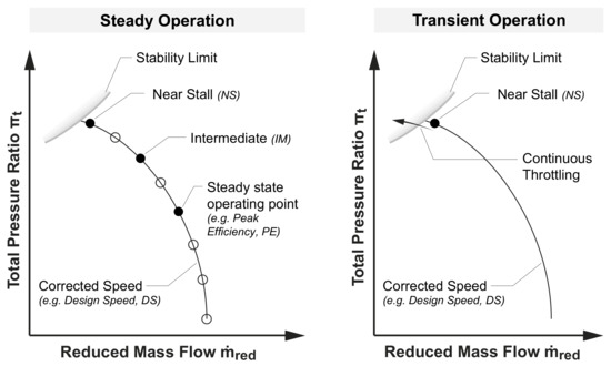The investigations within this work can be divided into steady and transient operation, as illustrated in Figure 3. Steady compressor operation (see Figure 3, left) is achieved at steady-state flow conditions, i.e., the flow parameters are constant throughout the measurement time. Hence, flow phenomena are analyzed at certain operating points, such as peak efficiency (PE), intermediate (IM), or near stall (NS), which are defined by fixed throttling conditions respectively. To examine flow phenomena during transient compressor operation (see Figure 3, right), the last stable operating point (NS) of the respective characteristic is set as starting point. From there, the back-pressure is continuously increased by closing the throttle. During this throttling maneuver beyond the stability limit, the flow quantities are measured. By means of a once-per-revolution trigger signal, the measured data can be assigned to the respective revolution. The data analysis methods are based on the procedures presented by Jüngst [9].