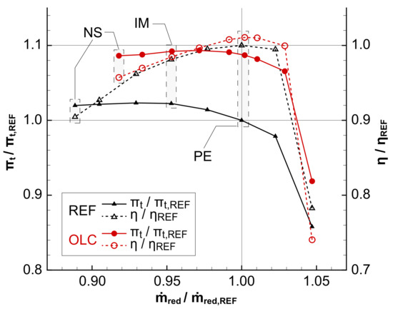 In order to assign the following analyses to the corresponding operating points in the compressor map, the characteristics of both investigated configurations, which were already examined in detail by Foret et al. [11], are shown in Figure 4. PE represents the operating point with the maximum efficiency. IM is an operating point with an increased back-pressure. NS represents the last stable operating point of the compressor characteristic. Foret et al. [11] pointed out several conspicuities between the OLC and the REF configuration at DS: