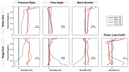 The steady aerodynamics were analyzed by using 5HP measurements and time-resolved WPT data during steady compressor operation. The 5HP data are shown in Figure 5 for the rotor and stage exit planes, respectively. All data are referred to the PE operating point of the REF configuration in such a way that the percentage deviation is depicted. In addition to the flow quantities pressure ratio, flow angle, and Mach number, a pressure loss coefficient was calculated as