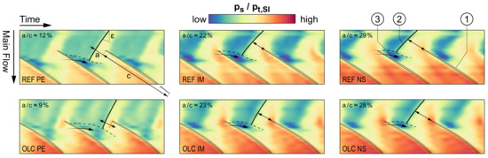 For all operating points, but especially for operating points at equal mass flows (PE and IM), an increased static pressure rise in the OLC configuration was visible. This indicated a higher aerodynamic blade loading within the tip region. Comparing both configurations with respect to the pressure rise along the characteristic, the pressure increased from PE to IM to NS due to an increased back-pressure, as expected. This caused the shock to move further upstream (a increased) and changed the inclination of the shock ( increased). The low pressure area of the tip leakage flow also moved upstream towards the rotor leading edge. It was noticeable that the tip leakage flow intensity for the OLC configuration at PE was lower than that for the REF configuration. As expected from the compressor map (Figure 4), the differences between IM and NS for the OLC configuration were smaller because the stability limit was reached at higher mass flows than for the REF configuration. At PE, the relative shock detachment , i.e., the shock detachment referred to the rotor tip chord length, was slightly smaller for OLC than for the REF configuration, whereas the relative shock detachment at IM and NS was similar for both configurations. The shifted shock position resulted in reduced mixture of the tip leakage and main flow and, thus, increased losses in the interaction zone with the shock. Ultimately, blockage within the passage increased, and might be an indicator for unsteady flow regimes in the vicinity of the aerodynamic stability limit. Because the OLC rotor already achieved these flow conditions at higher mass flows, this might be the reason for the loss in operating range compared to the REF configuration.