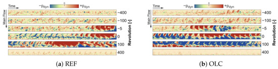 Next, the transient behavior of both configurations was analyzed at the stability limit (compare with Figure 3, right). In Figure 7, the time-resolved pressure deviation within the rotor tip region—captured by the axial WPT array (compare with Figure 2)—is plotted for selected revolutions to qualitatively analyze the stall inception mechanism. The quantity shown is based on methods proposed by Brandstetter et al. [8]. It shows the difference between the static wall pressure and a local ensemble average of the wall pressure of several previous rotor revolutions. In order to determine pressure fluctuations, which can be used as an indicator of aerodynamic disturbances, the difference is related to the dynamic inlet pressure. The stall inception is marked as revolution zero.