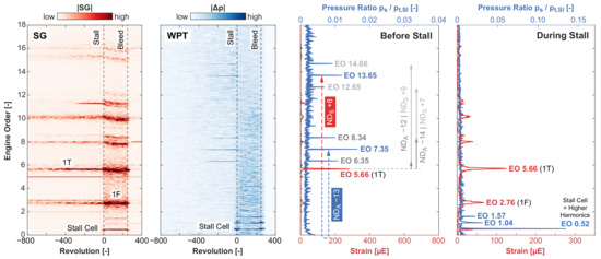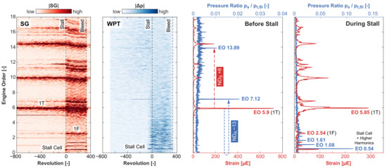 The same analysis method was applied to the data of the OLC configuration, as illustrated in Figure 9. Here, NSV occurred as well, apparent by 1T vibrations before stall inception, which were related to EO 5.66, as marked in the SG spectrogram and the corresponding peak-hold diagram. Considering the WPT spectrogram, several distinct peaks could be detected. Thus, the detected vibrations could be assigned to a fluid-structure coupling, as already seen for the REF configuration. Regarding the peak-hold diagram before stall inception, the peaks at EO 7.35 and EO 13.65 were associated to a backward traveling aerodynamic wave with an NDA −13 and a forward traveling structural wave with an NDS +8. In contrast to the REF configuration, additional peaks were visible in the WPT spectrogram that occurred at the same time. In the peak-hold diagram before stall, these peaks could be assigned to an NDS +7 in conjunction with an NDA −14, as well as an NDS +9 in conjunction with an NDA −12. Therefore, for the OLC configuration, most likely, several NDs were simultaneously present and superimposed. There was no indication that this phenomenon was due to the high aerodynamic loading of the OLC rotor. As for the REF configuration, the 1F mode vibrations and higher harmonics were excited during stall, as marked in the peak-hold diagram during stall. In contrast to the REF configuration, 1F mode vibrations already occurred before stall, but with low amplitudes. Again, this might be attributed to the higher rotor loading in general compared to the REF configuration. However, as mentioned before, the evaluated SGs are primarily sensitive to 1T vibrations, hence, 1F vibrations of the REF configurations might not be properly resolved by the selected SG.