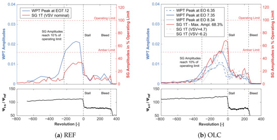 For the OLC configuration (see Figure 10b), the WPT amplitudes for EO 7.35 began to rise at revolution −400. The SG amplitudes reached 10% of their operating limit 300 revolutions before stall inception. In this case, the aerodynamic disturbances and vibrations began a bit earlier than for the REF configuration. This might be attributed to the higher loading of the OLC rotor, which was also visible by a higher pressure rise coefficient. The general behavior was similar to the REF configuration because the WPT and SG amplitudes increased rapidly until stall initiation, dropped down at revolution zero, and fluctuated more strongly on a lower level until the emergency bleed was activated. One difference here is that the SG amplitudes reached 68.3% of their operating limit, and therefore exceeded the amber limit, which is already defined as a critical operating range. Again, this might be attributed to the higher aerodynamic loading of the OLC rotor. As already mentioned before, for the OLC configuration, two further WPT peaks could be detected at EO 6.35 and EO 8.34. Therefore, the amplitudes for these two WPT frequency bands are also plotted in Figure 10b. The temporal progression was equal to the progression of EO 7.35, but the magnitude was a bit lower.