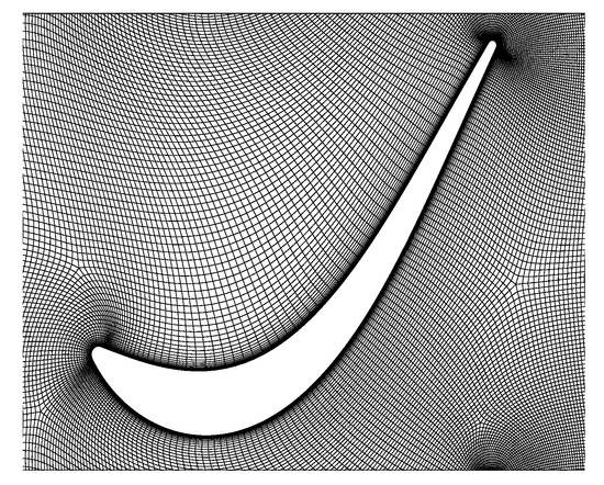 For the measured vane span, the spanwise flow components are of negligible order providing a nearly two-dimensional flow state. Therefore, the applied computational domain is reduced to only 5 cells in spanwise direction with symmetry conditions imposed on the spanwise boundaries. The numerical mesh discretizes the geometry of two WG passages and three stator vane passages, respectively. The resulting quasi three-dimensional mesh consists of ∼800,000 cells and relies on a block-structured grid topology as displayed in Figure 2 for one LPT stator. The boundary layers around the WG surfaces are resolved by a dimensionless wall distance of forcing the application of wall functions there. In the stator cascade, a wall distance of is never exceeded avoiding the usage of wall functions at the measured surface. The dependency of the results regarding a refinement of the mesh has been checked and found to be of negligible order.