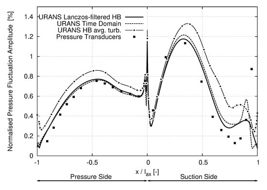 Looking on the suction side, again the time-integration and the filtered HB- approach agree over a substantial region of . In this region, the numerical results are supported by a satisfying agreement with the measurement data. As for the pressure side, the HB- approach overestimates the pressure fluctuation amplitude in this part of the suction side while still being able to capture the qualitative behavior in a suitable manner.