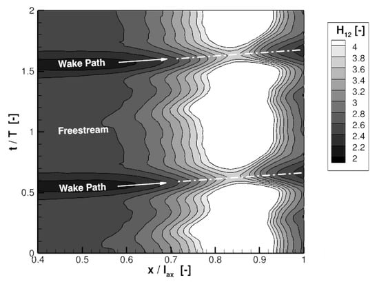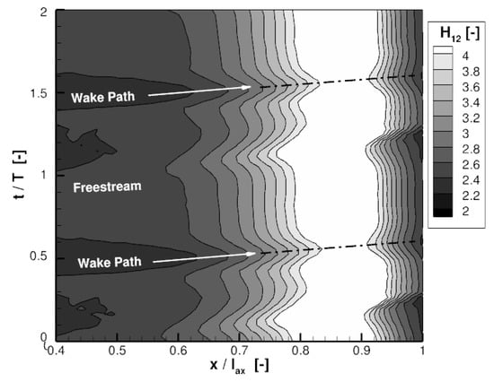 In Figure 6 and Figure 7, the space-time diagrams of the shape factor are displayed for two WG passings T. The focus is on the suction side in the range between . The results of the time-integration method are shown in Figure 6 and indicate a transition behavior alternating between separation induced transition at freestream and bypass induced transition at wake conditions, respectively. The flow separation at freestream condition marked by high values of the shape factor between is completely suppressed in the presence of the passing wake. This is highlighted by low levels of at resulting in a subsequent reattachment. The reattachment appears as a consequence of an increased turbulence level induced by the upstream located WG. This behavior is in-line with the findings of [12] where a separation bubble pulsating with the WGPF could be identified by means of pressure-sensitive paint.