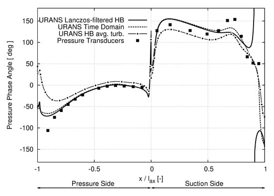 In terms of forced response driven excitation, the reliable prediction of the pressure fluctuation’s phase relation is of same importance as its associated amplitude. Therefore, results of the fluctuation phase relation are plotted in Figure 8. The numerical results for both the pressure and the suction side are synchronized in accordance with the recorded trigger signal linking the WG start position to the pressure tappings. As already noticed for the fluctuation amplitude, all investigated numerical approaches can reproduce the phase relation over vast parts of the pressure side between . Again, the HB- approach indicates a constant phase shift of approximately . However, all predictions of the fluctuation phase relation differ increasingly and substantially by proceeding further downstream towards the pressure side’s trailing edge at .