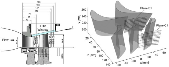 In the outer casing a glass window was mounted to allow LDV access to the flow channel. LDV data were collected in plane B1 after the stator and plane C1 after the rotor (see