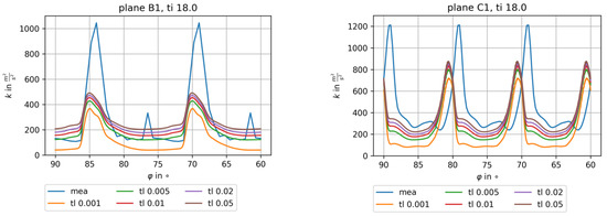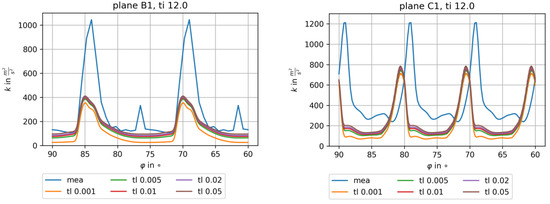 For the used test case, turbulence measurements in the inflow were not performed, but for other test configurations a very high turbulence intensity of 12–15% was found for the test rig. However, no data on the turbulent length scale were known. In order to find reasonable turbulence inlet boundary conditions, an unsteady Q3D flow study for varying turbulence inlet conditions was performed. The turbulence intensity was varied between 12% and 21% and the length scale between 1 mm and 50 mm. The results were compared with the measurements of the turbulence kinetic energy in planes B1 and C1, and are shown for a turbulence intensity of 12% and 18% in