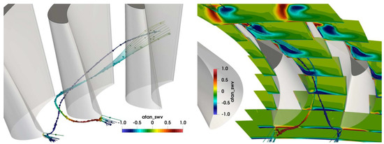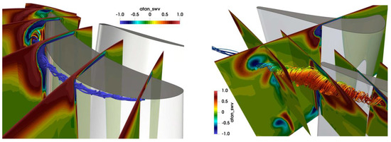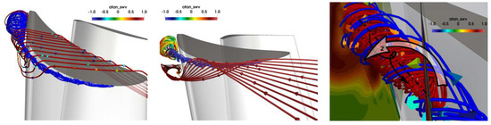 Figure 6, contours of normalized streamwise vorticity (SWV) and streamlines colored by SWV explain the formation of the secondary flow in the hub region. Positive values of SWV indicate clockwise rotation. In the left figure, the streamlines originating from the horseshoe vortex at the leading edge are depicted. The pressure-side leg moved immediately towards the suction side of the neighboring blade and was pushed towards mid-span at the channel exit. It kept its strong counterclockwise sense of rotation. The suction-side leg kept its original sense of rotation only for a short term and then also switched to counterclockwise rotation. The right figure is a view from the bottom in span-wise direction. The large blue zone of counterclockwise rotation, where the pressure-side leg of the horse-shoe vortex ends, was caused by the lower channel vortex. The suction side-leg rotated slowly around the vortex core. A small zone of clockwise vorticity starting at mid-chord in the corner of hub and blade suction side was a corner vortex driven by the channel vortex. At the trailing edge region, the channel vortex moved radially upwards, resulting in a trailing edge vortex sheet together with flow coming from the pressure side. This description of the secondary flow structure followed the work by Wang et al. [