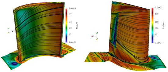 The effect of the described secondary flows can be clearly seen in the wall streamlines based on the wall shear stress on the rotor blade in