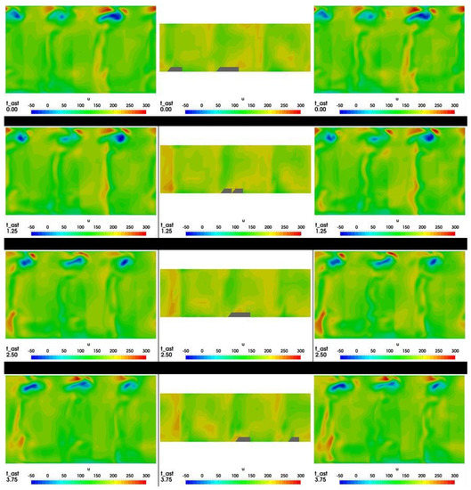 Figure 10. Results are shown for four time instants during 5 deg. of rotation, so that the flow repeats in the channel to the left. Simulation results are shown for turbulence inlet conditions of 18%/5 mm and 12%/1 mm to illustrate their influence. Looking at the simulation results, the three rotor wakes of lower velocity are slightly visible, moving from left to right. The flow differed remarkably between the three channels under the influence of the stator flow. The zone of higher velocity, clearly visible in the first two time instants, dissolves, whereas a new zone appears on the left in the next two time instants. In the shroud region, strong differences in velocity occurred, mainly due to the tip leakage flow. Zones of highest velocity appear close to the blue zones, indicating the backflow in the core of the leakage vortex, which varied strongly during the rotation. Comparing the numerical results of the two different turbulence inlet conditions, the main flow features were very similar, but slight differences regarding the backflow region, the shape of the wakes, and the zone of high velocity in the main flow can be clearly seen. Regarding the difference to the experimental results, it was larger than the one between the different turbulence conditions. The zone of high velocity was well predicted, but the phase lag already seen in