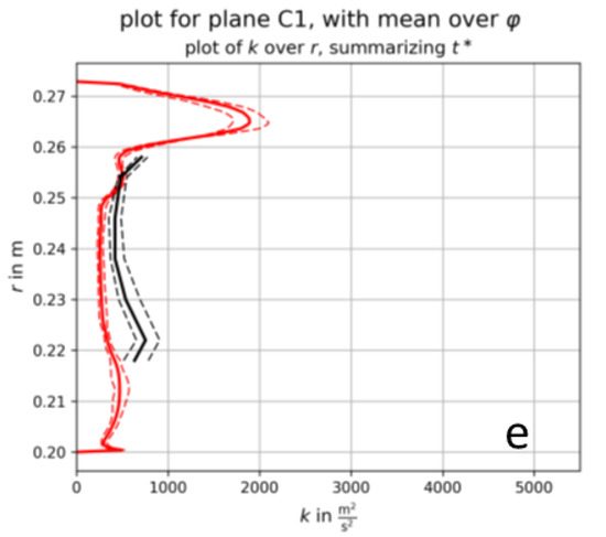 Since a two-dimensional LDV system was applied, only the velocities in the axial and circumferential direction were measured. Therefore, for the calculation of the turbulence kinetic energy k reliable estimations on the fluctuations in radial direction were needed. For this, turbulence measurements with a CTA system, performed by Bauinger et al. [