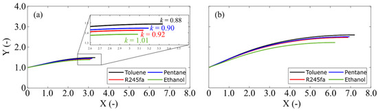 0) along 1000 points within the isentropic expansion from inlet to outlet pressure. This approach allows a qualitative understanding of the working fluid effects on nozzle shape, although larger discrepancies between the average value of k and the local slope of log(p/p