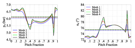 Finally, since most of the above-mentioned features of pitch-wise pressure distributions are induced by streamlines crossing Mach waves, similar trends can be detected for flow angle pitch-wise distributions in