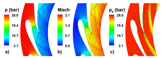 In the following, the results of the numerical calculations on the geometries are presented. First, static pressure, Mach number and total pressure distributions at mid-span are shown for the 15 vane–75° outlet metal angle case in