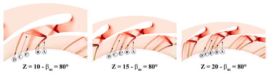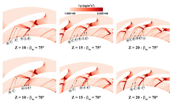 In fact, in the highest metal angle cases only the in-passage LR compression waves located right after the nozzle core exit plane can be found (tag E’). Conversely, in the intermediate metal angle cases, the first set (tag E’) is shifted downstream and the second set of compression waves (although of very weak intensity) can be seen toward the trailing edge (tag E’’).