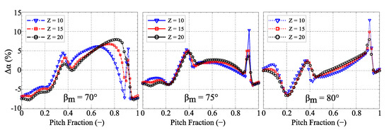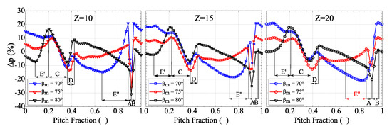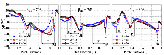 Figure 8, Z = 10), a slightly decreasing trend can be observed in the distribution behind the trailing edge location (lowest fractions of the pitch), which can be ascribed to the wake effect.