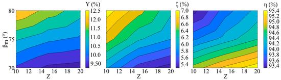 Figure 11 presents the contour plots for total pressure loss, kinetic loss coefficient and stator efficiency as a function of vane count Z and outlet metal angle β