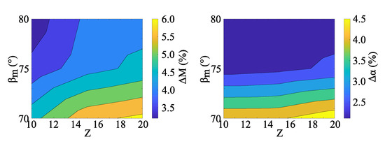 Figure 12 shows the contour plots of non-uniformity index for mid-span outlet Mach number and outlet flow angle (both in the absolute reference frame) at rotor inlet radius, as a function of vane count Z and outlet metal angle β