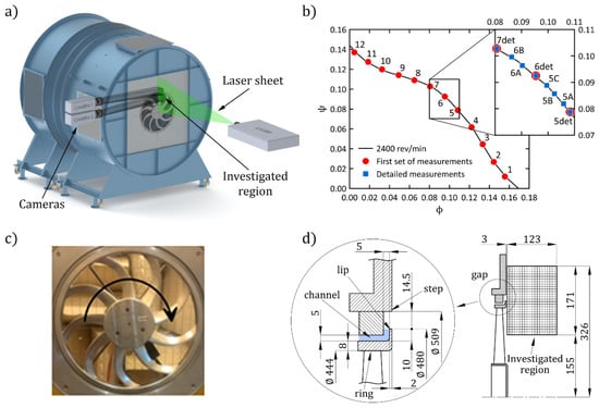 The measurement campaign has been carried out in the DIME Aeroacoustics laboratory with the fan mounted on a test rig specifically conceived and designed based on ISO 5801 norms, see Figure 1a. The tested rotor is a 9-blade aluminum prototype obtained by means of a numerically controlled milling machine; hence, it is geometrically very precise and, differently from rotors commonly employed in real cooling modules, it may be considered stiff. This prevents the geometry from being altered by the aerodynamic load or by the centrifugal force, an effect that could strongly affect leakage flow and radiated noise, e.g., see Canepa et al. []. The rotor has a tip radius of 222 mm, a hub-to-tip diameter ratio of 0.374, and a chord c which varies between 43 mm and 50 mm from hub to tip. At the design point, the flow coefficient is 0.0869, and the pressure rise coefficient is 0.0993, with the volume flow rate and the fan pressure rise (outlet static pressure minus inlet total one). The measurements have been carried out at constant rotational speed Ω of 2400 rev/min; depending on the operating point, the chord-based Reynolds number approximately ranges between 31,000 and 41,000 at the hub and between 186,000 and 188,000 at the tip. During the tests, and Ω have been continuously monitored; Ω has been measured by means of a one-per-revolution TTL signal generated by an optical tachometer. The gap between the rotating ring and the stationary casing is constituted by 5-mm-width axial and radial parts, see Figure 1d. No acoustic measurements have been taken in the present work.