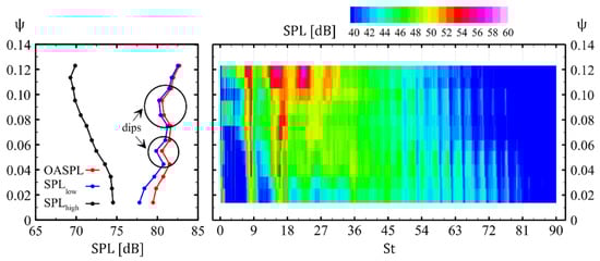 The comparison between OASPL, SPLlow, and SPLhigh shows that the difference between OASPL and SPLlow decreases from 2 dB to 0 dB as increases from the minimum to the maximum value. This means that the contribution from the high-frequency part is negligible. Hence, at all , SPLlow provides the major contribution to OASPL. Furthermore, the SPL spectrum contour plot indicates that crests and humps below the first three BPF harmonics () provide the major contribution to SPLlow. The ingestion of non-rotating large-scale flow structures results in spectral peaks or narrowband humps at BPF harmonics, see Hanson [] or Majumdar and Peake []. Peaks and humps at subharmonic frequencies are necessarily generated by the interaction of the rotor blades with co-rotating flow disturbances, e.g., see Magne et al. [] and Moreau et al. []. In the present configuration, the upstream flow has no prerotation; hence, such disturbances may only be contained in flow coming from the rotor, either through the gap or from the blades due to the reverse flow. Evidences of the existence of such a reverse flow were provided by Canepa et al. [], and blade stall in the tip region, possibly related to flow separation on the ring connection from radial to axial, is likely its cause. Flow separation in the hub region could also result in such a flow reversal, but it should affect the lower part of the blade span only, where the low velocity should result in minor contributions to the radiated noise.