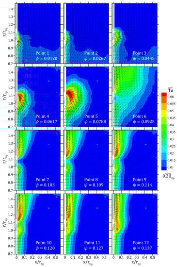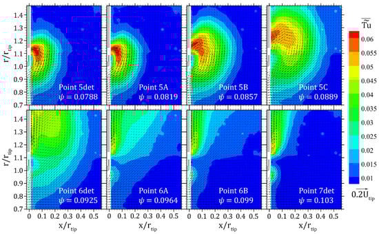 In order to provide an overall picture of the leakage flow in the gap region, 12 operating points have been first considered, see Table 1. The time averaged velocity fields are reported in Figure 3 together with the contour plots. At all values, the leakage flow may be identified by means of the high zone about the gap region, i.e., in the range 1.081–1.146. A higher stripe is present in front of the blade at all . Physically, high turbulence may depend either on convection or on local production. As the upstream flow entering the rotor has low , a physical explanation for such higher values could be the presence of blade stall, which could result in an instantaneous reverse flow possibly not detected in the time averaged vector plot. In fact, as already remarked, such a increase is likely due to the periodic flow fluctuations associated with the blade passage, and, in such a case, it should be disregarded as it has no physical meaning. On the contrary, is not affected by periodic oscillations and, hence, it provides information that is more physically reliable. The comparison between the contour plots of Figure 4 and the ones of Figure 3 shows that, at the same operating point (5det vs. 5, 6det vs. 6, and 7det vs. 7), no high stripe is present in front of the blade. Hence, it may be concluded that, at least at those conditions, no abnormal flow situation takes place in front of the blade. As such a flow behavior is typical of high blade loading, this conclusion should also apply to operation at lower , i.e., to points 1, 2, 3, and 4. On the contrary, in front of the gap region and at larger , both and attain similar values, thus indicating that periodicity in the leakage flow is likely weak. This observation contrasts with the case of the fan studied by Canepa et al. [], in which a strong periodicity in the leakage flow was observed at high . The geometrical differences between the two rotors prevent from providing a definite explanation for this flow difference.