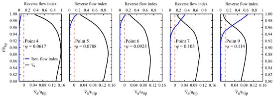 Furthermore, at all , a large- stripe is present in front of the blade but upstream of this area is smaller. This indicates that turbulence is not convected there by the main flow. As already mentioned, such high values are only partially due to the blade passage unsteadiness, since that high unsteadiness area is present in front of the blade tip in some of the plots of Figure 4 also, i.e., at 0.0964, 0.0996, and 0.103. Such a local maximum is present at all of the higher loading points also, and its presence indicates that either turbulence is produced there or some related flow features are hidden in the time averaged vector plots; the observation of some instantaneous velocity fields, see Canepa et al. [], showed that, at high, a reverse flow may be present at the blade tip. In order to provide further evidence to this assumption, regions of reverse flow need to be identified. To this aim, a reverse flow index RI has been computed along the radial traverse closest to the blade ( 0.0135) for each . Assuming that reverse flow in front of the blade is related to negative values, such an index is simply defined as the percentage of instantaneous samples with out of the 800 acquired ones. Its profiles related to operating points 4, 5, 6, 7, and 9 are reported in the plots of Figure 5 together with the ones. The trend of RI is rather regular: it is very small or even null along most of the span and then it increases in front of the blade tip. At point 4, it does not reach 0.05, indicating that instantaneous negative is statistically not significant. At points 5 and 6, the trends are rather similar, and the maximum value is approximately 0.15. At point 7, the maximum value increases to more than 0.3 and at point 9 it reaches 0.65. The region where the reverse flow index is not null gradually increases in size with , but it extends from 0.97 to 1 at point 4 and from 0.92 to 1 at point 7. The profiles have qualitatively similar trends, but at points 7 and 9 a change in convexity takes place at 0.96; furthermore, at point 9, slightly negative values are attained beyond 0.99. Instantaneous negative values may be related to the presence of reverse flow coming from the blade but also to turbulent vortexes convected by the mean flow. However, compared to the low cases, at high , the strength of the turbulent vortexes associated with the leakage flow is smaller due to the higher decay that has already been discussed. Furthermore, they should not significantly contribute to the mean velocity sign, as the flow sampling is not synchronized with their passage, which is random. Hence, their contribution to the instantaneous negative , i.e., to RI, is expected to be less important at high . This supports the assumption that, at least at point 9 but likely at point 7 also, a reverse flow coming from the rotor is present.