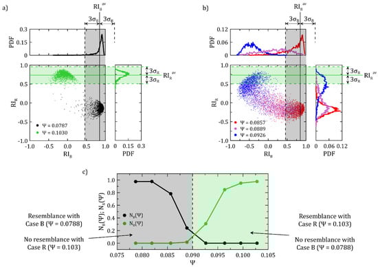 Resemblance index properties: (a) scatter plots of RIB and RIR for the reference cases; (b) scatter plots of RIB and RIR at Ψ = 0.0857, 0.0889, and 0.0925; (c) NB and NR dependence on Ψ.