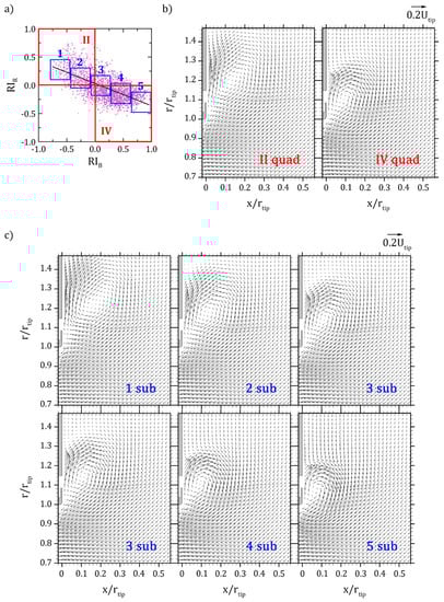 Averaged velocity fields at Ψ = 0.0889: (a) subsets employed for the averaged velocity fields; (b) averaged fields related to the II and IV quadrants; (c) averaged fields related to smaller subsets (the case 3 sub was reported in both rows in order to ease comparisons).
