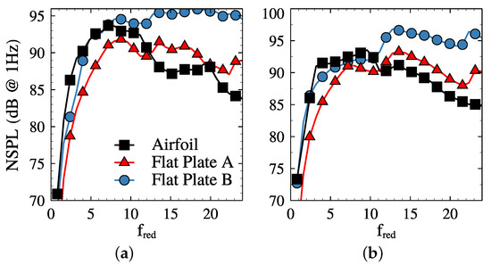 Non dimensional sound pressure level (NSPL) comparison between actual airfoil and equivalent flat plates, A and B. (a): inlet; (b): outlet. Note that the dimensionless pressure and reduced frequency of the flat plate B have been computed using the inlet properties for consistency.