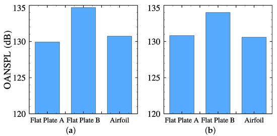 Alternatively, the spectra retrieved by the flat plate B overestimate the Airfoil results by up to 10 dB. At low frequencies, i.e., , there is a reasonable agreement between the airfoil’s results and flat plate B. Nonetheless, at higher frequencies, the differences between both approaches become large. Consequently, flat plate A yields a better agreement with the airfoil’s result than flat plate B, as shown in Figure 4. This highlights the role of the leading edge as the major contributor to sound generation, especially at . The following analyses will therefore focus on further comparing the flat plate A results with the airfoil.