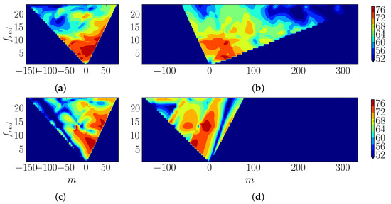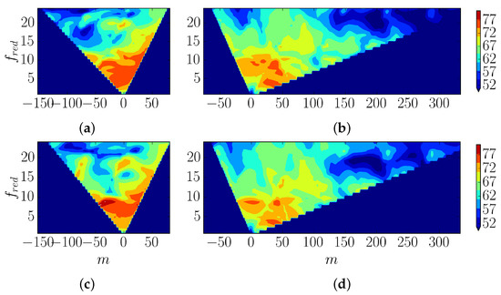 To provide a more detailed broadband noise footprint, the NSPL modal decomposition is depicted in Figure 5. The y axis corresponds to the reduced frequency, while the x-axis represents the azimuthal mode index: . Figure 5a,c show the results obtained at the inlet with the actual and flat plate geometry. The latter exhibits a straight line of extremely low pressure, caused by the dipole behaviour of the flat plate, corresponding to a directivity , because the plate’s dipole cannot radiate in directions parallel to itself. The highest noise levels arise close to the cut-off condition for positive m because the regions of maximum radiation are normal to the plate. On the other hand, the simulations accounting for the actual geometry do not show such preferred directions. At low frequency, , noise is radiated fairly homogeneously along the whole cut-on region. This is likely to be produced by the presence of additional noise sources that do not arise in flat plates and also by the reflection of acoustic waves between neighbouring blades.