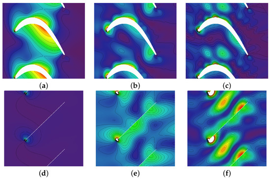 Figure 6 shows the pressure root mean square value (RMS) at three different frequencies for both the airfoil and flat plate geometries, where a different colour scale is used in each column for enhanced visualisation. This figure highlights the different acoustic sources present in both geometries. However, a note of caution is sounded as a high pressure RMS region is not directly equivalent to a sound source because the hydrodynamic pressure does not lead to sound generation. Anyhow, the pressure RMS can provide valuable information to understand the effect of the airfoil on noise generation, compared to flat plate geometries. At low reduced frequency, , the flat plate clearly presents a dipole pattern in the leading-edge, justifying the observations performed in Figure 5c,d. The regions with high-pressure RMS are located in the leading-edge, as predicted by quasi-steady aerodynamic theories. On the other hand, the turbine airfoil presents several regions of high levels of unsteady pressure, namely the leading-edge, the suction side peak Mach number region, and the pressure side where the flow starts to accelerate. These may correspond to volumetric noise sources, associated with the stretching of vorticity, which are known to produce sound [4]. Moreover, as the acoustic wave-length normalised with the chord is about 0.2, the case can be considered acoustically compact and we may relate the pressure directly with the radiated noise, as deduced from Curle’s analogy [25]. This explains the larger noise levels exhibited by the airfoil at low frequencies, compared with the flat plate case (see Figure 3). This noise mechanism is analogue to that described by Marble and Candel [26] for entropy waves, which lead to sound generation when they propagate through a non-uniform mean flow.