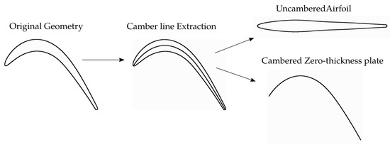 The objective of this section is to highlight the origin of the discrepancies between the results produced by the flat plate approximation and the actual geometry. For that aim, the effect of blade turning and thickness will be separated as follows. The blade camber line and thickness profile are computed, so that a new uncambered airfoil with the same thickness profile as the original turbine is built. This process is sketched in Figure 7. The base flow around the cambered plate is computed using the same boundary conditions as those used with the original geometry. Alternatively, the base flow around the uncambered airfoil is computed so that the inlet Mach number is the same as in the airfoil.