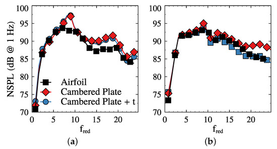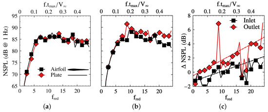 Figure 8 compares the spectra retrieved by the uncambered airfoil cascade to the equivalent flat plate. In agreement with other authors, it is observed that the thickness decreases the radiated noise at high frequencies. As proposed by Gershfeld [3], the thickness-based reduced frequency () is displayed, so the results may be compared with others in the literature. Figure 8a,b compare the absolute spectra obtained with the airfoil and flat plate geometries at the inlet and outlet, respectively. Clearly, the airfoil thickness has a stronger effect on the downstream radiated noise. This point can be better observed in Figure 8c, which displays the difference between the flat plate and the airfoil. In spite of some large oscillations, most likely attributed to the effect of resonances and the 2D simplification, a clear trend can be observed.
