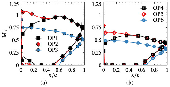 Isentropic Mach number distribution on the airfoil at the different OP considered. (a): OP1-3, (b): OP4-6.