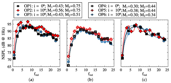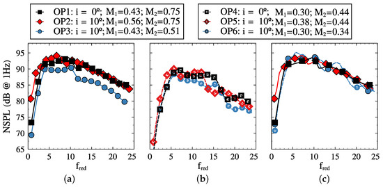Figure 12 and Figure 13 show, respectively, the inlet and outlet NSPL at all the OPs considered obtained. Figure 12a,b show respectively the results of OPs 1–3 and 4–6, which have been segregated into two sub-figures for clarity. Figure 12c shows the spectra of OP1-3 and OP6 scaled as explained in the lines below; the spectra of OP4-5 are not included for readability purposes. The information depicted in these Figures is complemented by Figure 14, where the spectra modal decompositions are shown, and the cut-on regions at all the OP are seen.