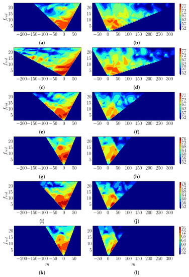 NSPL modal decomposition at all the OP considered. Left column: inlet. Right column: outlet. (a,b): OP1; (c,d): OP2; (e,f): OP3; (g,h): OP4; (i,j): OP5; (k,l): OP6.The scale is saturated below the lower limit for enhanced visualisation.