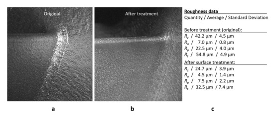 * Roughness Rt: original 54.8 ± 4.9 µm, finished 32.5 ± 7.4 µm.