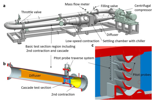 After passing the centrifugal compressor, the working fluid was decelerated in the diffuser and entered the settling chamber, where the stagnation pressure p0 and temperature T0 were recorded. The mass flow rate through the wind tunnel was measured utilizing a device in the return of the wind tunnel. The compressor running speed n controlled the flow rate. The wind tunnel’s temperature level was controlled using an electrical heating system (not shown in Figure 3) and the coolant mass flow through the chiller. In combination with the inventory forward control (i.e., the amount of working fluid mass in the closed wind tunnel), stable operation conditions were achieved during the tests (for further details see Reinker et al. [12]). In CLOWT, a two-stage contraction zone accelerates the flow. The first subsonic axisymmetric nozzle (standard diameter DN500 to DN250) offers a moderate contraction ratio of about 3.7. The second nozzle accelerated the fluid up to the desired inflow conditions (see Figure 3b). In the present study, the second contraction was established by a three-dimensional nozzle based on additive manufacturing.