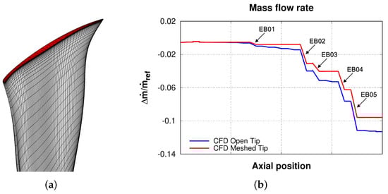 The impact of blade tip clearance modeling was evaluated by comparing two different approaches. The baseline tip model, referred to as “open tip”, was used in a previous study []. It exploits a periodic boundary across a non-meshed region over the top of the blade tip to treat the clearance flow as an orifice flow with local interpolation of the conservative variables across the blade tip. In the second model, called “meshed tip”, the blade tip gap region is fully discretized using an O-type mesh (Figure 2a) that matches the external grid in the blade-to-blade plane. The two models adopt the same number of cells in the spanwise direction. The mass flow rate distribution along the entire compressor, with and without the meshed tip rotor, is reported in Figure 2b. The operating condition is the reference one, at the working point, with five mass-flow extractions that are located along the meridional flow-path (indicated as EB in the Figure). It can be easily observed how for the “open tip” model, the outlet mass flow is reduced by , and so it is less conservative as opposed to the “meshed tip” one. For this reason, the new accurate “meshed tip” has been chosen for modeling the compressor rotor blade tip clearance.