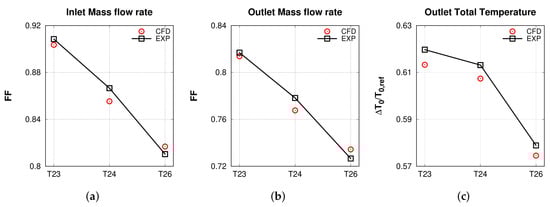 where x is equal to T23, T24, and T26. The agreement between numerical results and measured data is good. The averaged total temperature at the outlet shown in Figure 3c appears to be slightly underestimated for all the three cases. Consequently, numerical analyses tend to overestimate the total-to-total adiabatic efficiency and to underestimate the compressor’s work input.